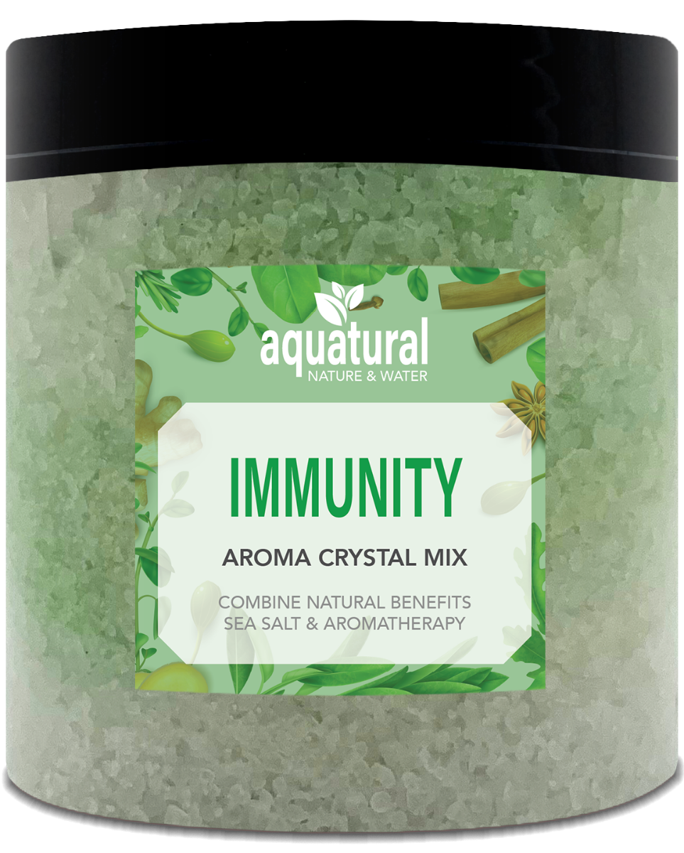 Ontspan en verjong met het Aquatural IMMUNITY aroma kristallen badzout voor spa's en jacuzzi's. Geniet van de therapeutische effecten van Eucalyptus, Citroen, Tea tree, Den, Rozemarijn, Kruidnagel, Sinaasappel en Tijm en voel de voordelen voor lichaam en geest. Verpakking van 350 gram. #wellness #badzout #spa #jacuzzi